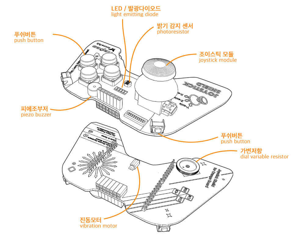 조이스틱 센서 쉴드로 새로운 재미를 만들어 보세요.비디오 게임을 직접 만들고, 드론을 조종하고, RC카를 만들어 볼 수 있습니다.