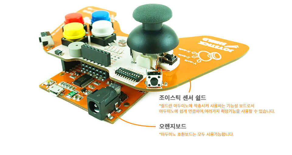 조이스틱 센서 쉴드는 보드와 같이 사용합니다.조이스틱 센서 쉴드는 오렌지보드와 결합하여 사용할 수 있는 제품입니다. 단독으로 사용하는 제품이 아닙니다. 오렌지보드뿐만 아니라 아두이노 호환보드는 모두 사용가능합니다.