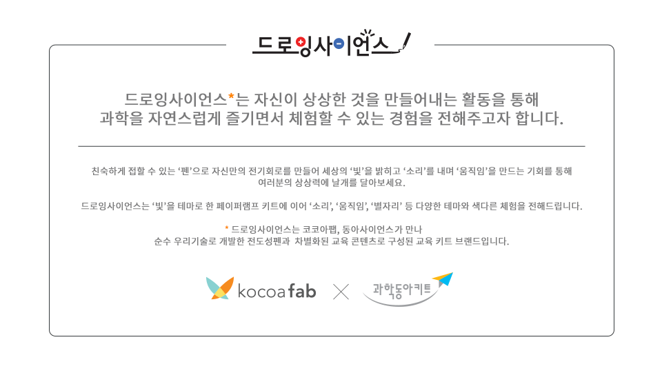 키트 활용방안 드로잉사이언스는 키트를 활용한 교육 뿐 아니라 펜으로 그린 회로와 간단한 부품을 활용하여 다양한 창작에 응용될 수 있습니다.