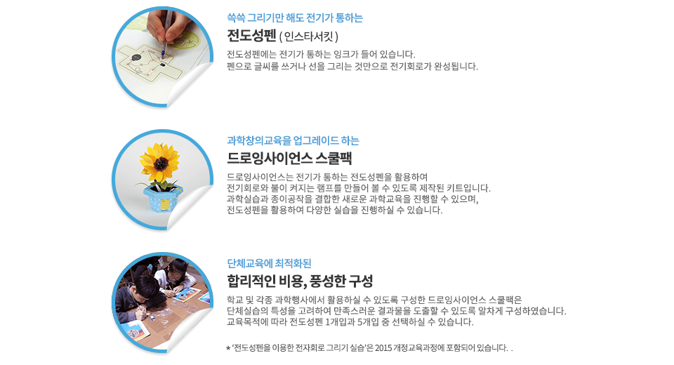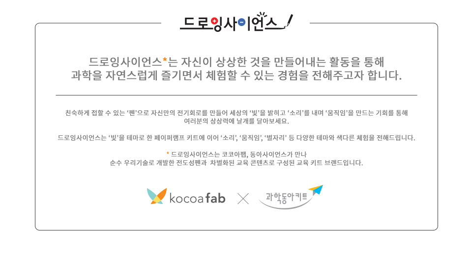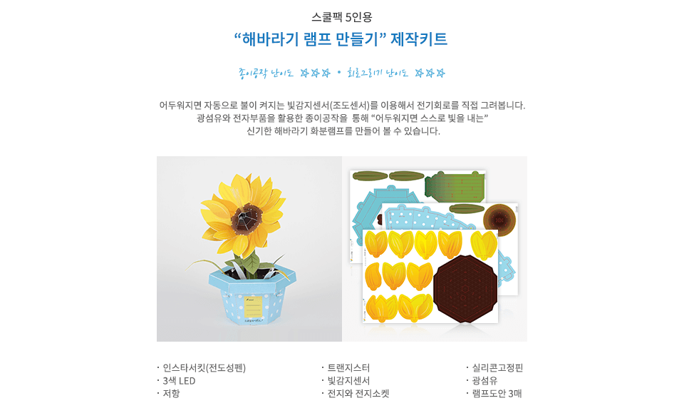 드로잉사이언스 스쿨팩은기존에 출시된 1인용 실습키트와는 달리, 학교 및 각종 과학행사에서 단체실습용으로 활용하실 수 있도록 구성한 스쿨패키지(5인실습용) 입니다. 단체실습의 특성을 고려하여 구성부품에서 실습 콘텐츠까지 새롭고 알차게 구성하였습니다.